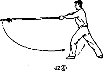 4. 重心前移,成左弓步,同时向前做中平扎枪动作, 目视枪尖。(图42④)