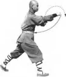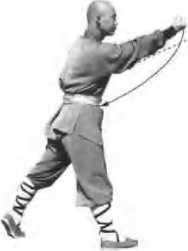 (2) Keep the above action, change the right hand into fist and hold It on the waist, ihe left hand grabs forward into fist. Eyes lcx>K al the lefl Us{ (Rgure 21)
