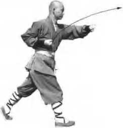 (3) Keep (tie above action, the right fist thrusts forward Ihroogh above the left fist from me wajst, with the fist-palm up; the body stands up, shift Ihe barycenter to the r丨ght leg. Eyes look 丨orward. (Figure 22)