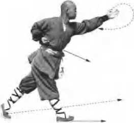 上动不停。左手从右臂外侧向前上方穿出, 右拳同时回收腰间,身体向前倾斜,下肢动作不变;
