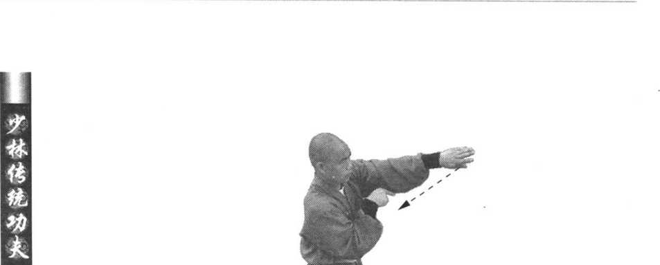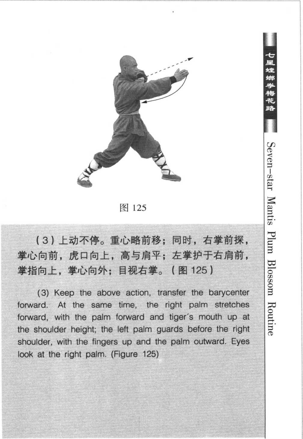 shaclin traditional kurigfii series Ixsr图126(4) Keep the above action, bend elbow of the right arm, change the paim into mantis hook, hang wrist and pull it before the chest, with the hook tip downward. At the same time, the left palm stretches forward, with the palm outward and the fingers forward at the shoulder