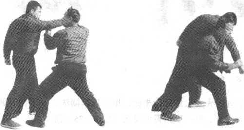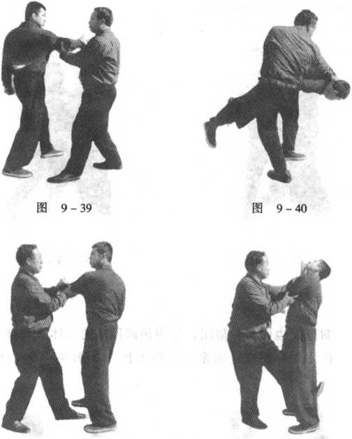 金钩挂环和顺手牵羊相似,抓手缠臂如图9-39所示,用上 领带下拦踢而见跤(图9-40)o广义地讲,凡是用腿里勾外咬 的都是金钩挂环法。