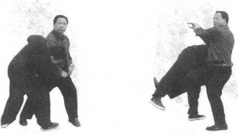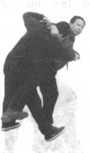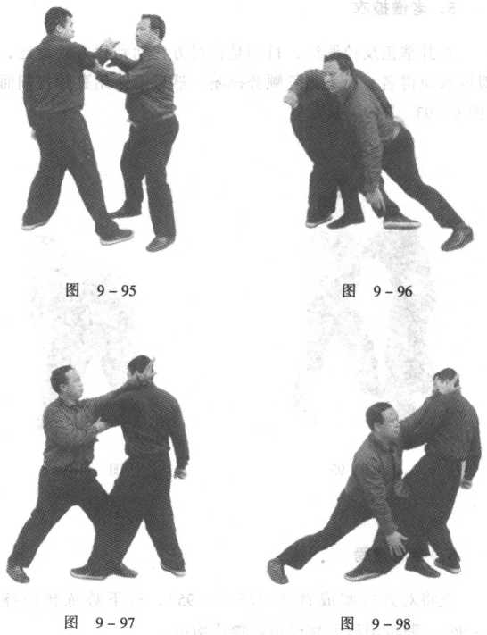 “出樨”是在对方手臂下钻出钻入之意。偏门接手抱臂进中 门,举臂内钻向前扑撞,下边同时以勾腿狸猫上树(图9-99, 图9-100)。