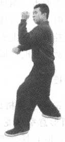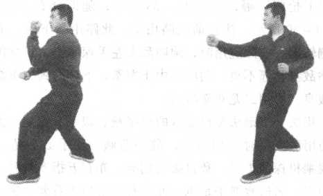 向前戳击之右手回撤变捋拿,左手向上抱裹(图11 -40)o 左脚前进寸步,右脚随进的同时,释开右手向前打直击拳(图 ll-41)o