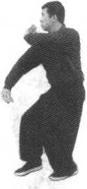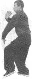 右脚向前迈一步变右护肩掌,如图11-42所示。练法参阅 上述之法,其要领相同,惟左右方向相反。翻身法,左脚在前右 转身,右脚在前左转身,均以护肩掌开始变式。