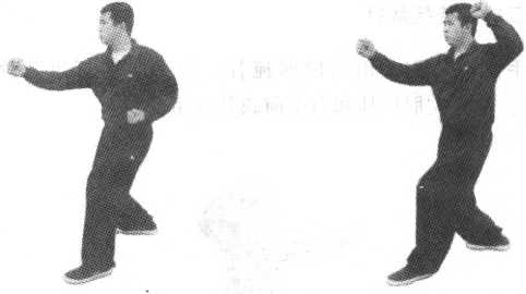 前右转身,右脚在前左转身,以护肩掌变式而练之。