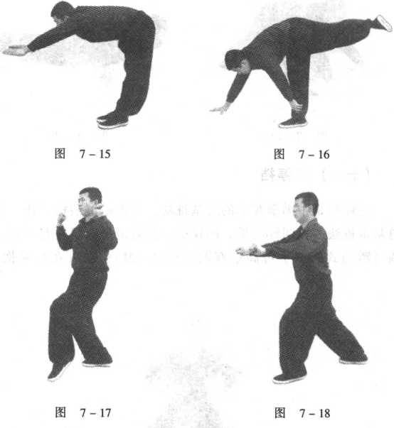 7-18),后拉时前脚撤回,脚尖点地。左右相同,方向相反。此 功主练前后活动步法和前扑之力。