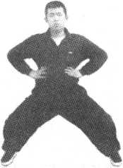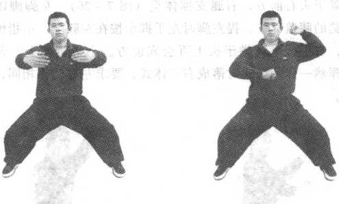三停裆是中国拳跤术的筑基桩功,马步站桩装桶子劲,是拳 道基本桩法,也叫浑元桩、两仪桩。其方法是双腿左右开立,做 骑马蹲裆式,双手可高掐双肋(图7-21);也可在胸前抱圆,
