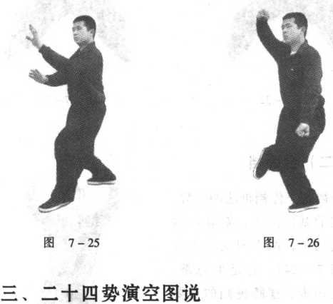 腿向右横向打开(图7-28),双手向右上方拉涮。左右动作相 同,方向相反。