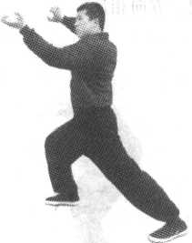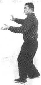 合卧裆是三停裆桩法的变势。 在骑马桩的基础之上,双膝向内 合卧成夹马桩,两手向头前上方 外撑(图7-24)0它是形意拳、 八卦掌的扣步、摆膝裹裆的重要 功法,是里勾外咬呼拉裆腿法的 基本功。不站此桩,三体式裆膝 不合,不合就发劲不整,发劲不 整就不能谈及六合之功。