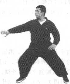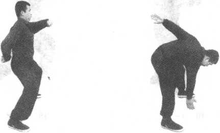 吻的用法很多。吻就是近身贴靠,近身、发力是拳跤术的两 大法宝。二十四式为基本功的演空,吻是全身粘挨贴靠用力之 法。练习方法是右手盘肘入手(图7-29),右手用意抓对方后 腰部。当右手向右臀部回抓的同时,左脚后划成骑马状,左手横 于胸前(图7-30),右手自后向前抡摔,弯腰低头并向裆内甩 手(图7-31)o表演时可打手拍身见响以显其劲威。左右动作 相同,方向相反。