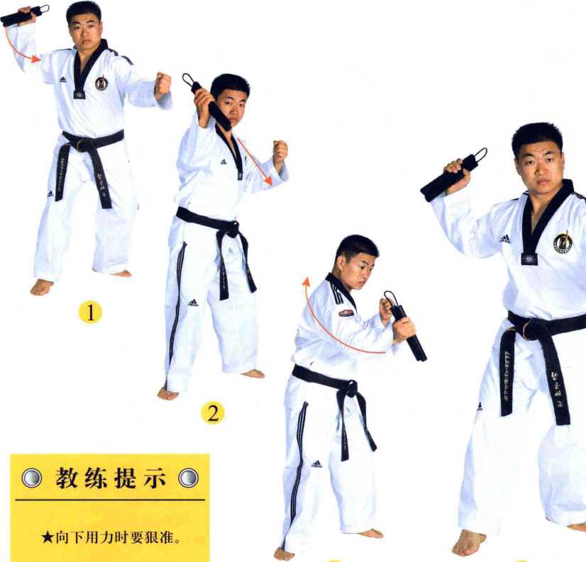 拧转腰部,右手握棍由上向下用力砸击对手胸肋部。(2、3) 右手握棍原路收回,恢复起式。(4)