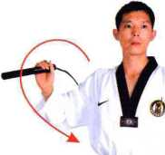 右手夹棍开始。 上右肩,垂于 打至左腰侧。