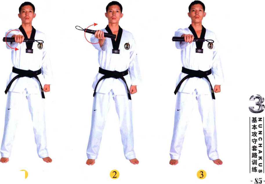 数,力尽而至,左右手练法相同。(1 ~3 ) 节,増强腕力。