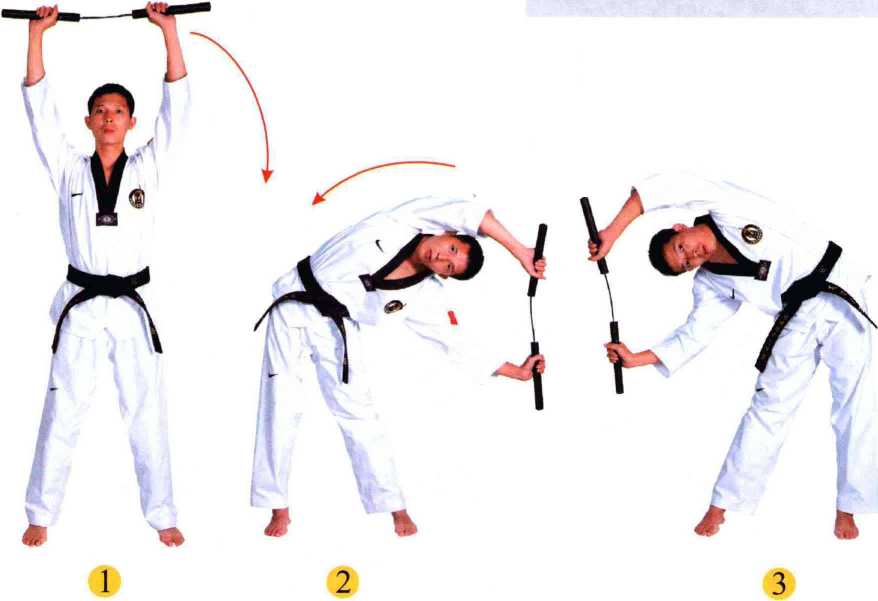 两脚开立,双手分握棍,高举过头,右手用力拉 扯棍子,带动上身向左侧下方尽量侧俯。(1、2)