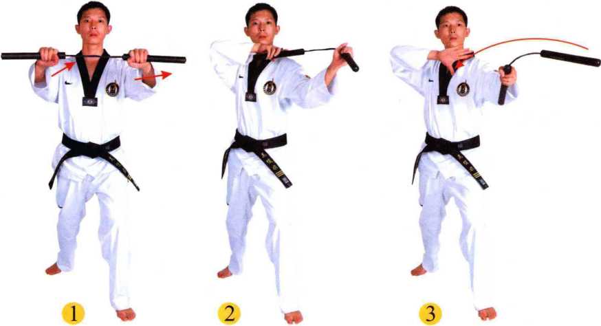 小弓步站立,双手握棍前上举。(1) 左手前拉,右手至左颈前。(2)