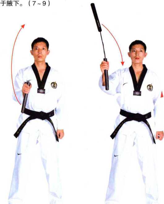 转动手腕,使棍在右上方打一小弧圈向身体后方 荡去,左手迅即自身前转至背后,握住B棍。(3) 然后右手脱棍,左手握B棍向上向后荡去,右手