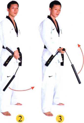 松开腋窝,手臂前伸的瞬间,右腕立刻 运劲将B棍挥弹而出。(2、3)