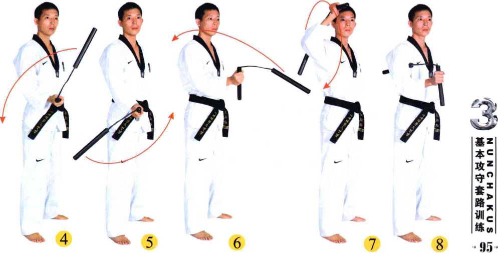 右手握棍在体侧面向上向后立圆 抡棍(也可向下向后)。抡完收回腋 下。(2~8)