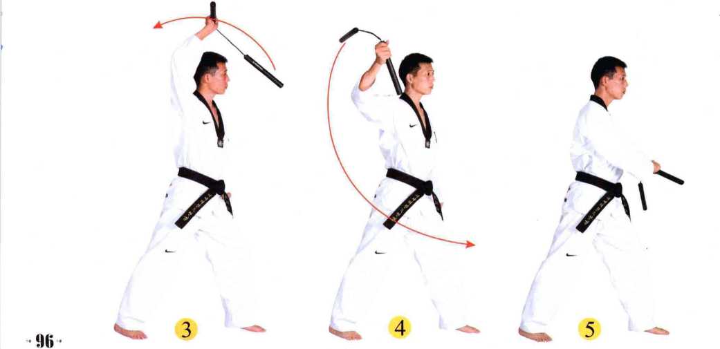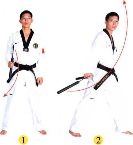 ★挥棍的手臂稍弯曲,棍走平圆, 速度均勻。此法主要用于保护头部 并伺机出击,打击对手太阳穴、脸 颊等部位。