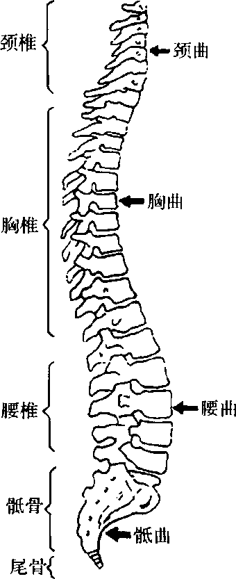 脊柱有4个生理性弯曲,即突向前的颈曲和腰曲,突 向后的胸曲和舐曲。其中颈曲和腰曲两处活动度较大。
