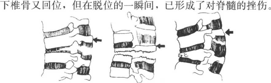 打击脊柱的解剖学效应,应是韧带撕裂、椎骨骨折、 椎骨脱位、脊髓挫伤。(见图66)有时也可能不发生椎骨 骨折,而只有椎骨脱位,脱位后作用力消失,在韧带牵拉