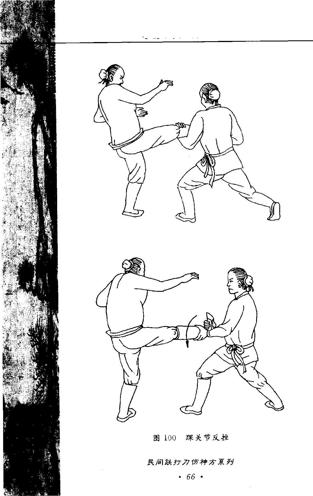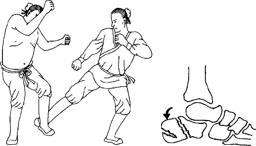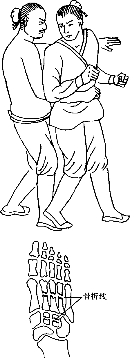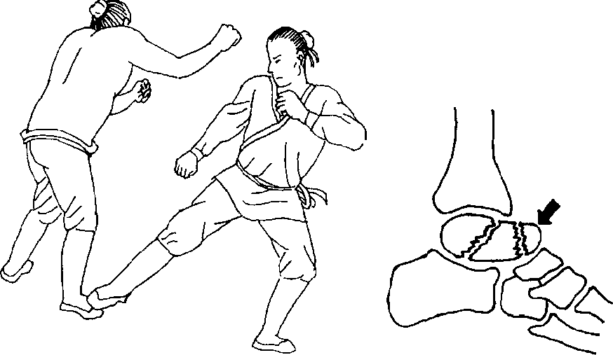 踝关节与膝关节伸直位一样,不具有旋转功能,当膝 处于伸直位时,用力左右拧扳踝关节可使人体翻转倒地, 严重者还会引起韧带撕裂甚至脱位。(见图100)