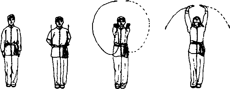 两脚并步不动,两膝伸直;两手由拳变掌,直臂经体前、体 侧至头顶上方,抖腕亮掌,五指并拢,指尖相对,掌心向上;仰 头目视双手(图1 -4)。