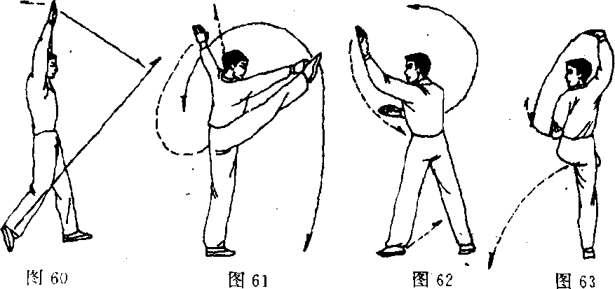 (3)(图61)接做“提膝亮掌”时,首先注意单拍脚后,右 腿边下落边稍转体,这时的身体感觉是右腿下压,上肢上顶,这 样的动作过程舒展、幅度大,而且便于衔接下一动作;同时,还 要注意(图62)两腿要微屈,身体重心逐渐移至右腿,速度的 变化同第2点。