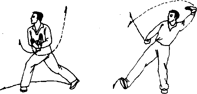 (1) “弓步劈拳”前的几步要快速、连贯,并转出弧形(图 43),不要停顿,右脚着地,马上接做劈拳。同时,左手拇指张 开搂摆幅度要大0