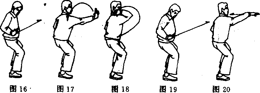 ③右肘下沉,右单指手向前、向下弧形收至右腰侧,手心朝 前,食指朝上;目视右单指手(图16)。