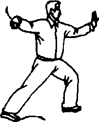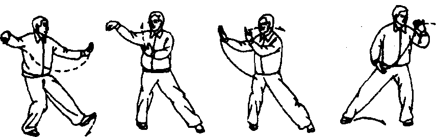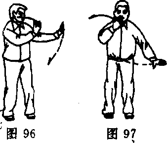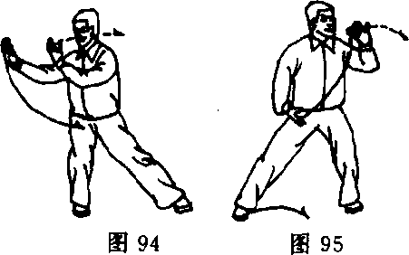 ③上体再向右转;同 时,左手经腹前向右上划 弧至右肩前,手心斜向后; 右手向右侧运转,手心翻 向右,随之左腿向左横跨 图91