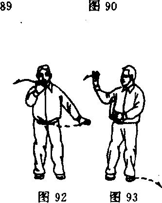 图88图88图87图87②上体慢慢左转,身体重心随之逐渐左移;左手由面前向左 侧运转,手心渐渐转向左方,右手由右下经腹前向左上划弧,至 左肩前,手心斜向后;同时,右脚靠近左脚,成小开立步(两脚 距离约10-20厘米);目视右手(图90、91)o