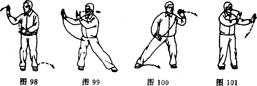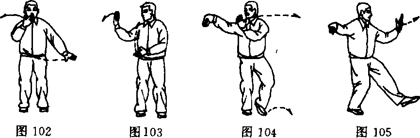 ①上体向右转,右手随之向右运转,至右侧方时成勾手;左 手经腹前向右上划弧至右肩前,手心向内;身体重心落于右腿, 左脚尖点地;目视左手(图102、103、104)o