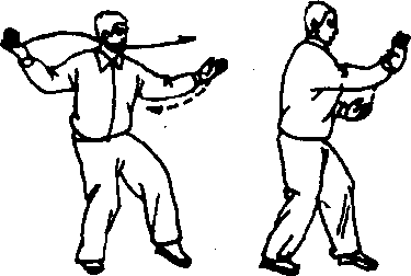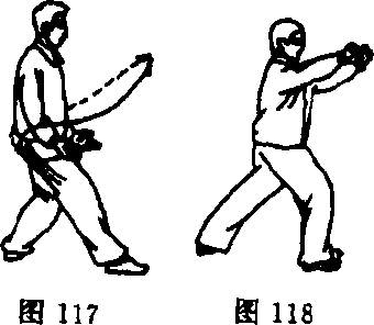 ②右脚向右前方落下,身体重心渐渐前移,成右弓步,面向 右前方;同时,两手下落,慢慢变拳,分别从两侧向上、向前划 弧至面部前方,成钳形状,两拳相对,高与耳齐,拳眼均斜向内 下(两拳中间距离约10 -20厘米);目视右拳(图117、118)0