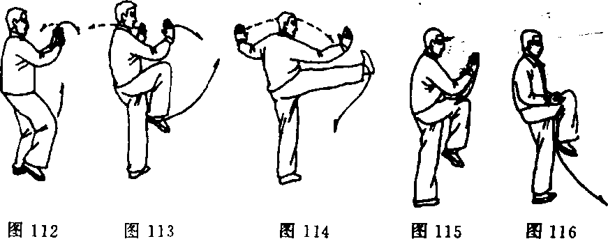 ①右腿收回,屈膝平举,左手由后向上、向前落至体前,两 手心均翻转向上,两手同时向下划弧分落于右膝盖两侧;目视前 方(图 115, 116)0