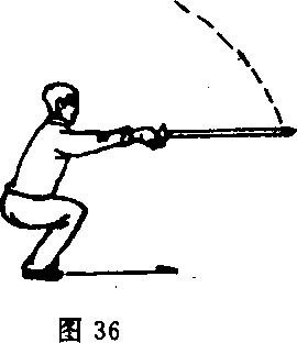 屈膝半蹲,左腿稍屈膝,左脚前脚掌虚着地面,成左虚步;右臂 内旋使拇指一侧朝下,用剑的前端下刃向前上方划弧翻转,随着 上身起立成虚步,右手持剑再向右后上方托起,左手剑指仍附于 右手腕,两肘均微屈;目视剑的前端(图39)。