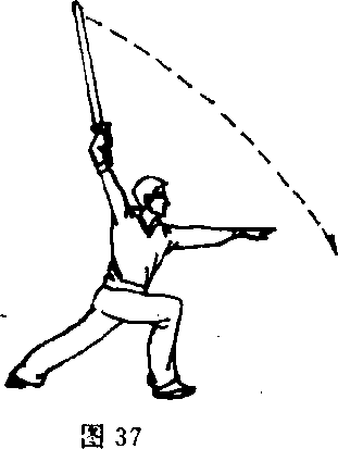 右脚上步屈膝;同时,左脚脚跟稍内转,左腿挺膝伸直,成 右弓步;右手持剑直臂向上挑举,剑尖向上,手心朝左,左手剑 指仍向前平伸指出,手心朝下,上体稍微前倾;目视剑指(图 37)。