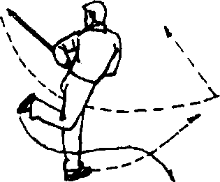 ①左脚经体前上一步,右脚随之在身后离地,小腿后弯;同 时,右臂外旋手朝里,使剑由右向上,向左屈肘划弧,剑至上体 左侧时,右手靠近胯旁,拇指一侧在上并向上屈腕,左手剑指在 右手向左下落时附于右手腕上;目视剑尖(图41)。