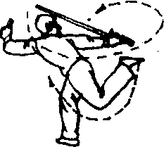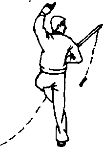 跃步和上挑动作必须协调一致,迅速进行;挑剑时,腕部要 猛然用力上屈;形成平衡动作后,右腿略屈膝站稳,左小腿尽量 向上抬起;上体向右拧转,剑身斜举于右侧上方,持剑略松,便 于手腕上屈。
