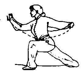 此段动作难点主要是第6、第7动,重心容易起伏过大,击 掌动作容易上下肢脱节。正确的做法,应该上步弓步与击掌同时 完成。第7动左、右换掌要注意肩臂放松,力点在手掌的外沿。