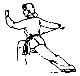 ②在转髓蹬腿完成左弓步的同时,左手屈臂成90度,大臂 与肩平,拳面朝上,右手从腰间做平冲拳,高于肩平,拳背朝 上;目视右手前方(图2-17)。