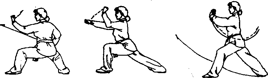 点在拳面,与下额同高 向后摆动,拳眼朝下, ,臂稍屈,拳面朝上;右手经胸前向卜、 目视左手前方(图2-15)。