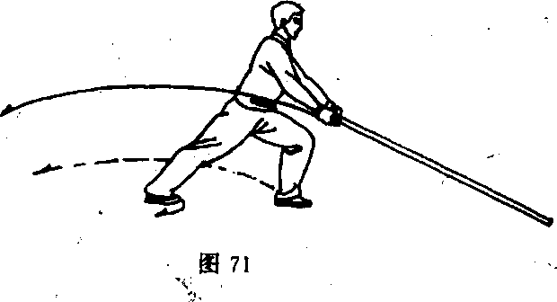 上体左转,右脚向后退一大步,左腿半蹲,右腿蹬直成左弓 步;同时,两手在腹前转腕,即左手向左前使棍梢由身后向上、 向前抡圆点地;此时,两臂伸直,两手位于膝盖前;目视棍梢 ’(图 71)。