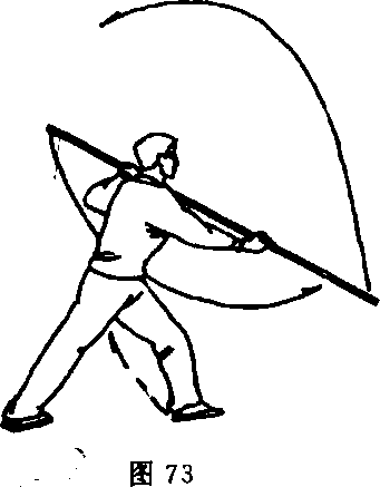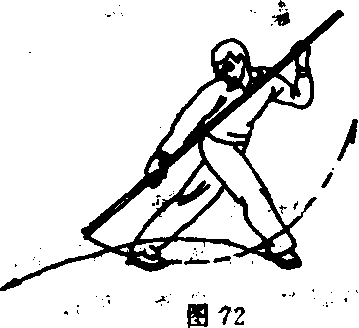 身体重心启机上体右转, 左脚随即从身后向右侧插一步成 交叉步;同时,左手先上抬并向 棍梢一端滑握,右手随即从把端 略向中段滑握,使棍把由腹前向 转体后的身体右下方戳击;此时, 右臂向右下方伸直,左臂型肘于 左胸前,手心向里,上体谒向左 倾斜;目视棍把(图72)。