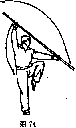 起成右独立势;同时,右手向右后上方举起,左手则向身体左侧 平伸推出,手心向上,使棍中段向左上方架拦,棍梢指向左斜下 方;目向左前平视(图74)。