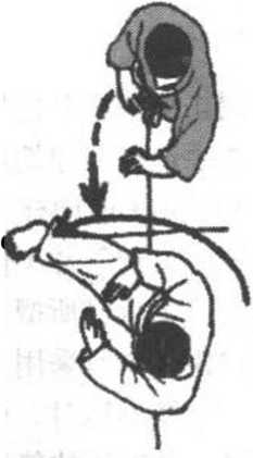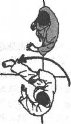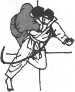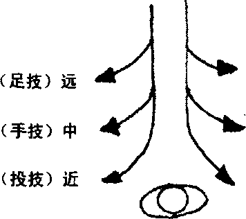 (图952)所示为防御后的三种可能的反击距离和常用反击 法(左、右相同),即防御后离对方较远时,多采用足技反击; 若距离较近,则宜采用手技反击;而在近距,则可顺势采用投技 或短程之拳、足反击。一般来说,根据距离决定运用何种反击是 通用的。