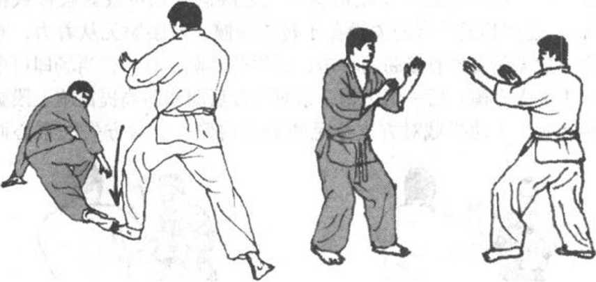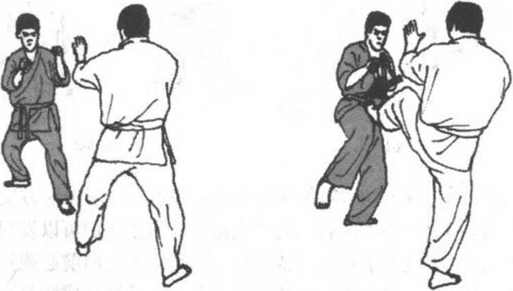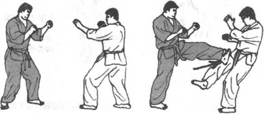 (图957、958)和(图959、960、961)显示的为两种以攻击 方式拦截反击对手后足大幅度踢击的实战图例。前组图例,选手 选择的拦截部位是对手攻击腿同侧之腰傲(也可攻其腹部或裆 部)。盖因起腿发力的关键在于转腰旋散。若腰髓无从着力,对 方自然无法发出有威胁的攻击,而拦截准确、有力,当场即可令 对手失去平衡。后一组图例,系对方以后腿屈膝高提欲施上段旋 踢之时,主动拦截对方支撑足膝关节内侧,令对方失去重心而
