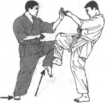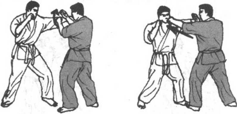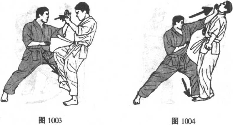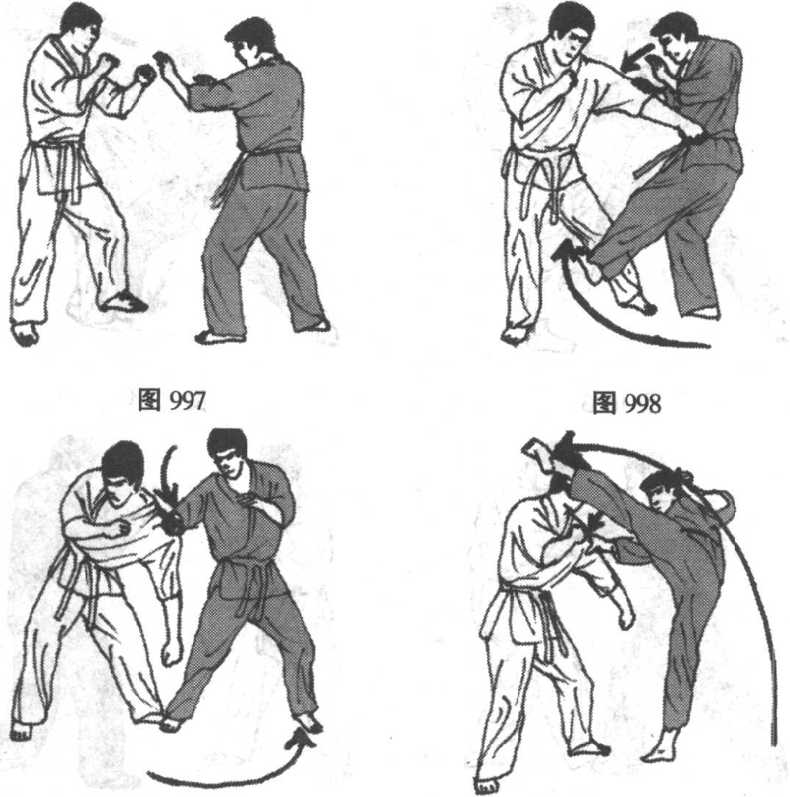 (图997、998、999、1000)所示为一组边格挡边控制边反击 的组合式防御反击法。当对手以中、上段直拳攻击时,选手从外 侧格挡并顺势紧抓对手空手道衣袖向后推带,同时拂足踢对方前 腿小腿或踝关节部位,令其失衡。选手顺对方重心前俯之势,逆 时针滑转至对方盲点区,而~手仍然继续对对方肩臂加压推带, 使对方无从调整,不停,立即施以上段旋踢连续反击。