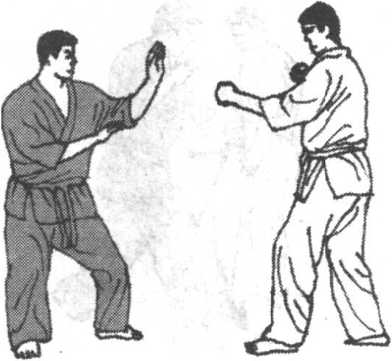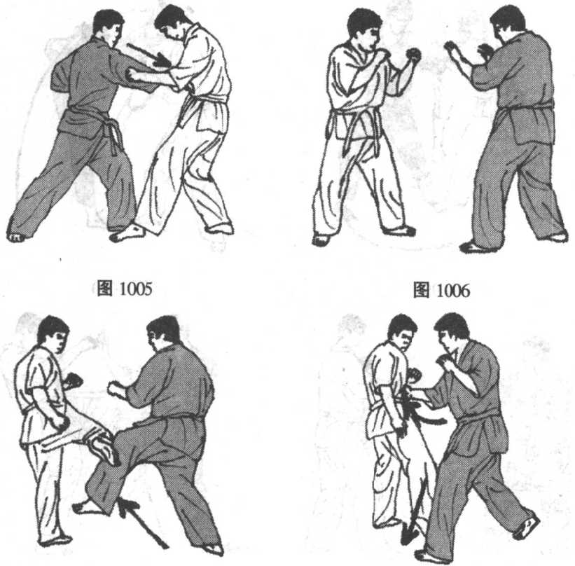 (图1001、1002、1003、1004、1005)实战图解是一组连续向 前的阻压式反击。当对方欲起腿攻击时,选手主动并步向前一手 高提护面,一腿提膝以胫骨正面封阻对方小腿胫骨,使对方无法 伸展发力。不停,选手借体重前冲惯性,封阻之膝继续向前加压 于对方之膝并积极向前落步,在迫敌重心后倒之际如冲直拳般伸 展底掌猛烈反击对手下巴。不停,后手中段重拳连击,必可予敌 重创。(图1006、1007、1008)实战与前组防御反击战术意图相 似,亦是主动提膝前迎阻封,使对方下段旋踢半途即遭拦截,而 选手更顺势向对方前足外侧落步施以上击拳反击。